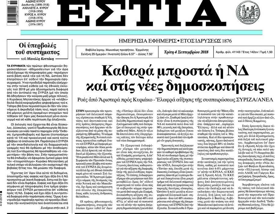 Σύμφωνα με το ρεπορτάζ της εφημερίδας «Εστία» η ψαλίδα μεταξύ των δυο πρώτων κομμάτων μοιάζει να διαμορφώνεται σε μονοψήφιο νούμερο, αλλά δεν αναφέρονται συγκεκριμένα ποσοστά. Ο ΣΥΡΙΖΑ εμφανίζει άνοδο της συσπείρωσής του και η ΝΔ με τη σειρά της φαίνεται πως εξακολουθεί να κινείται σε υψηλά ποσοστά συσπείρωσης.