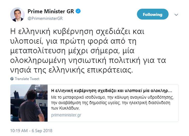 «Η ελληνική κυβέρνηση σχεδιάζει και υλοποιεί, για πρώτη φορά από τη μεταπολίτευση μέχρι σήμερα, μία ολοκληρωμένη νησιωτική πολιτική για τα νησιά της ελληνικής επικράτειας» γράφει στη σελίδα του στο Twitter, ο πρωθυπουργός, Αλέξης Τσίπρας, παραθέτοντας λεπτομέρειες και σχετικό βίντεο, στο πλαίσιο των ενεργειών της κυβέρνησης υπό τον τίτλο «ήταν δίκαιο και έγινε πράξη».