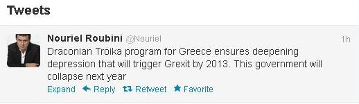 Σύμφωνα με σχόλια του στο twitter, ο κ. Ρουμπινί, επέκρινε τη σκληρότητα των μέτρων που επιβάλλει η τρόικα στην Ελλάδα, εκτιμώντας ότι το μοναδικό αποτέλεσμα που θα έλθει από αυτά ειναι η επιδείνωση της ύφεσης και η συνέχιση του πτωτικού σπιράλ. Αυτά τα μέτρα θα ωθήσουν πιο γρήγορα τη χώρα εκτός ευρώ το 2013, η κυβέρνηση θα καταρρεύσει τον επόμενο χρόνο, ανέφερε χαρακτηριστικά.