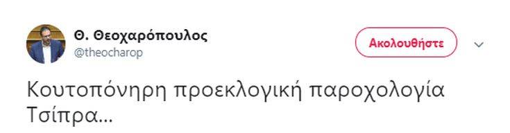 Την ομιλία του Αλέξη Τσίπρα στη ΔΕΘ σχολίασε ο πρόεδρος της ΔΗΜΑΡ και κοινοβουλευτικός εκπρόσωπος του Κινήματος Αλλαγής, Θανάσης Θεοχαρόπουλος. Με ανάρτησή του στο Twitter έκανε λόγο για «Κουτοπόνηρη προεκλογική παροχολογία Τσίπρα».
