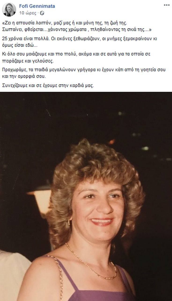 Μια συγκινητική ανάρτηση έκανε στον λογαριασμό της στο Facebook η πρόεδρος του ΠΑΣΟΚ και επικεφαλής του Κινήματος Αλλαγής, Φώφη Γεννηματά, με αφορμή τη συμπλήρωση 25 χρόνων από τον θάνατό της μητέρας της, Κάκιας Βέργου.