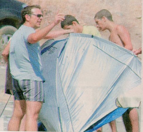 Ο ίδιος φορτώνει και μεταφέρει τα πράγματα και όλο τον εξοπλισμό από το αυτοκίνητο και από εκεί στην παραλία. Ωστόσο, όπως φαίνεται και από της φωτογραφίες, το στήσιμο της καλοκαιρινής «κατασκήνωσης» δεν είναι το δυνατό του σημείο.