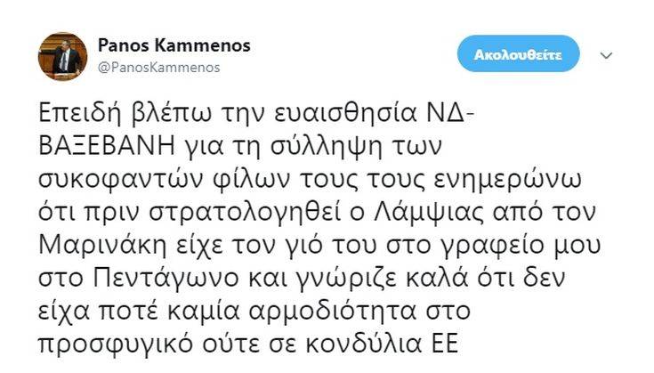 O υπουργός Άμυνας, Πάνος Καμμένος, με ανάρτησή του στον προσωπικό του λογαριασμό στο Twitter τοποθετήθηκε για τη σύλληψη των τριών δημοσιογράφων του «Φιλελεύθερου». Συγκεκριμένα ο κ. Καμμένος έγραψε: «Επειδή βλέπω την ευαισθησία ΝΔ-Βαξεβάνη για τη σύλληψη των συκοφαντών φίλων τους, τους ενημερώνω ότι πριν στρατολογηθεί ο Λάμψιας από τον Μαρινάκη είχε τον γιο του στο γραφείο μου στο Πεντάγωνο και γνώριζε καλά ότι δεν είχα ποτέ καμία αρμοδιότητα στο προσφυγικό ούτε σε κονδύλια ΕΕ».
