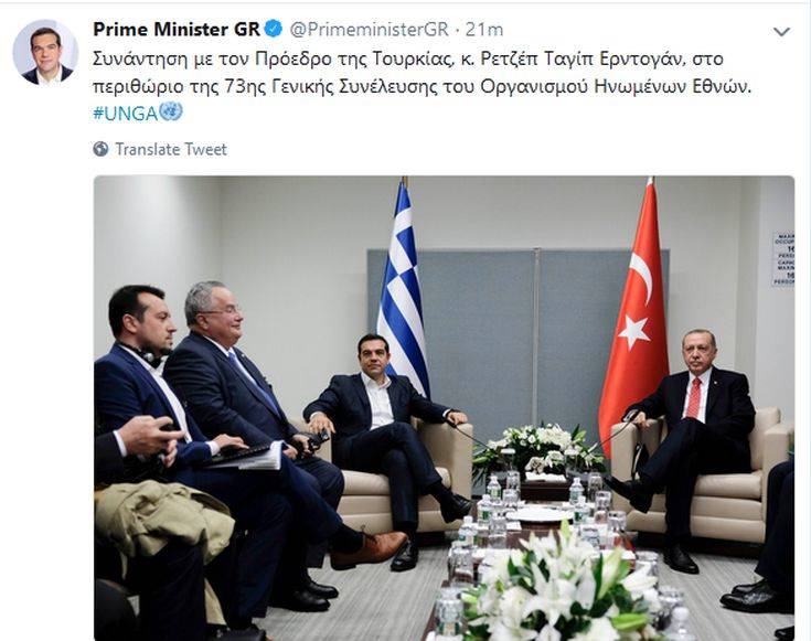 Ολοκληρώθηκε η διμερής συνάντηση του Έλληνα πρωθυπουργού, Αλέξη Τσίπρα, με τον Πρόεδρο της Τουρκίας, Ρετζέπ Ταγίπ Ερντογάν, στο περιθώριο της 73ης Γενικής Συνέλευσης του ΟΗΕ, στη Νέα Υόρκη.