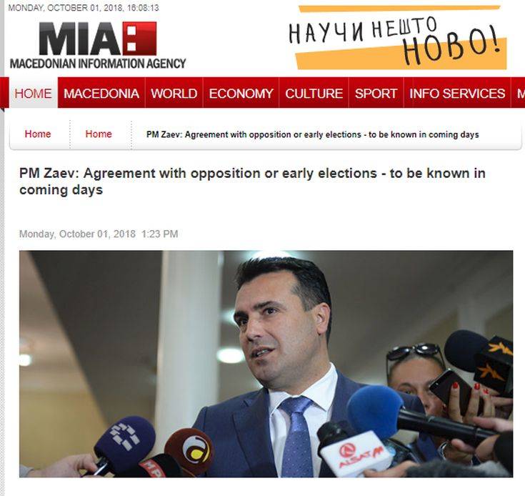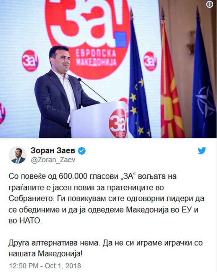 Κρίσιμες αναμένεται να είναι οι επόμενες μέρες όσον αφορά μια ενδεχόμενη συμφωνία του Ζόραν Ζάεφ με την αντιπολίτευση των Σκοπίων, για συνταγματική αναθεώρηση, στον απόηχο του ισχνού «ναι» στο χθεσινό δημοψήφισμα στη χώρα. Όπως μεταδίδει το πρακτορείο MIA, ο πρωθυπουργός της ΠΓΔΜ θα στραφεί άμεσα στην αντιπολίτευση για να εξεταστεί το ενδεχόμενο συμφωνίας, αλλιώς η χώρα θα πάει σε πρόωρες εκλογές. Ο Ζόραν Ζάεφ καλείται τις επόμενες ημέρες να βρει τις ψήφους 11 βουλευτών, ώστε να εξασφαλίσει την απαιτούμενη πλειοψηφία των 2/3 για να προχωρήσει σε συνταγματικές αλλαγές που προβλέπονται στη Συμφωνία των Πρεσπών.