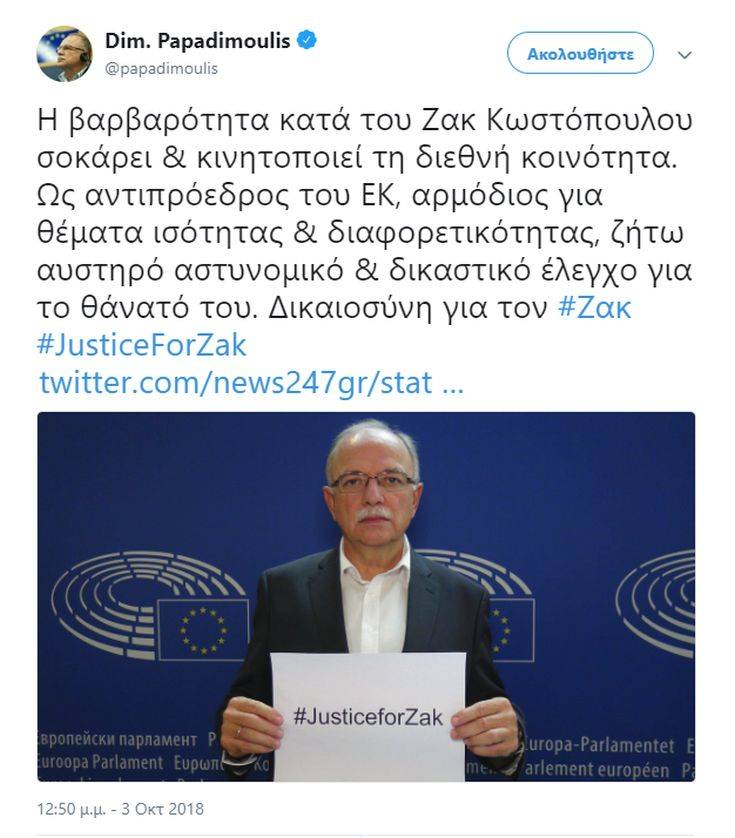 Αυστηρό αστυνομικό και δικαστικό έλεγχο για τις συνθήκες θανάτου του Ζακ Κωστόπουλου, ζητά ο αντιπρόεδρος του Ευρωπαϊκού Κοινοβουλίου, Δημήτρης Παπαδημούλης, ο οποίος σε ανάρτησή του στο Twitter γράφει τα εξής: «Η βαρβαρότητα κατά του Ζακ Κωστόπουλου σοκάρει και κινητοποιεί τη διεθνή κοινότητα. Ως αντιπρόεδρος του ΕΚ, αρμόδιος για θέματα ισότητας & διαφορετικότητας, ζητώ αυστηρό αστυνομικό & δικαστικό έλεγχο για το θάνατό του. Δικαιοσύνη για τον #Ζακ».