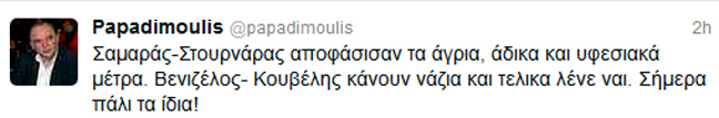 «Σαμαράς-Στουρνάρας αποφάσισαν τα άγρια, άδικα και υφεσιακά μέτρα. Βενιζέλος- Κουβέλης κάνουν νάζια και τελικά λένε ναι. Σήμερα πάλι τα ίδια».
