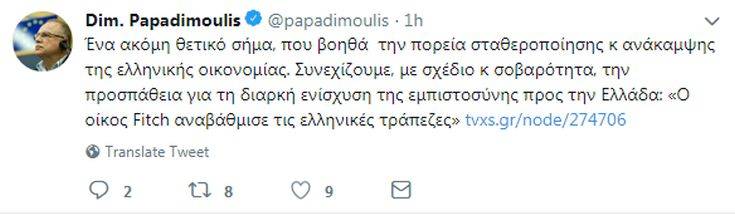 Θετικό σήμα χαρακτηρίζει ο αντιπρόεδρος του Ευρωκοινοβουλίου και επικεφαλής της ευρωομάδας του ΣΥΡΙΖΑ, Δημήτρης Παπαδημούλης, την αναβάθμιση των ελληνικών τραπεζών από τον οίκο Fitch. «Ένα ακόμη θετικό σήμα, που βοηθά την πορεία σταθεροποίησης και ανάκαμψης της ελληνικής οικονομίας. Συνεχίζουμε, με σχέδιο και σοβαρότητα, την προσπάθεια για τη διαρκή ενίσχυση της εμπιστοσύνης προς την Ελλάδα: “Ο οίκος Fitch αναβάθμισε τις ελληνικές τράπεζες”», αναφέρει ο κ. Παπαδημούλης με ανάρτησή του στο Twitter.