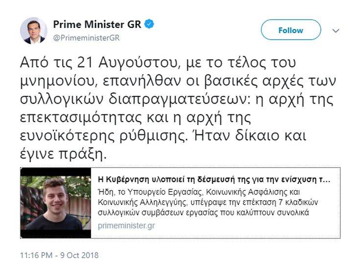 «Από τις 21 Αυγούστου, με το τέλος του μνημονίου, επανήλθαν οι βασικές αρχές των συλλογικών διαπραγματεύσεων: η αρχή της επεκτασιμότητας και η αρχή της ευνοϊκότερης ρύθμισης. Ήταν δίκαιο και έγινε πράξη» επισημαίνει ο πρωθυπουργός, Αλέξης Τσίπρας, με ανάρτηση του στο Twitter.