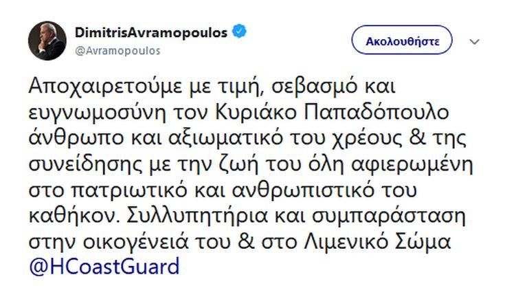 Τα συλλυπητήριά του, για τον χαμό του 44χρονού υποπλοίαρχου του Λιμενικού Σώματος, Κυριάκου Παπαδόπουλου, έδωσε μέσω ενός tweet, ο Επίτροπος Μετανάστευσης, Εσωτερικών Υποθέσεων και Ιθαγένειας, Δημήτρης Αβραμόπουλος.