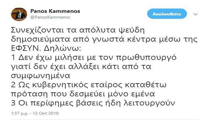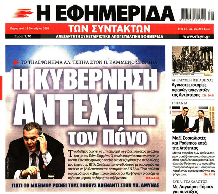 Αντιπαράθεση ξέσπασε ανάμεσα στον πρόεδρο των Ανεξάρτητων Ελλήνων και υπουργό Άμυνας, Πάνο Καμμένο, και την «Εφημερίδα των Συντακτών» μετά από ρεπορτάζ της εφημερίδας με τίτλο «Η κυβέρνηση αντέχει… τον Πάνο», σύμφωνα με το οποίο ο πρωθυπουργός επικοινώνησε με τον Πάνο Καμμένο, ο οποίος έδωσε εξηγήσεις για τις δηλώσεις του έκανε στις ΗΠΑ για την ΠΓΔΜ και για αμερικανικές βάσεις στην Ελλάδα. «Συνεχίζονται τα απόλυτα ψευδή δημοσιεύματα από γνωστά κέντρα μέσω της ΕΦΣΥΝ. Δηλώνω: 1. Δεν έχω μιλήσει με τον πρωθυπουργό γιατί δεν έχει αλλάξει κάτι από τα συμφωνημένα. 2. Ως κυβερνητικός εταίρος καταθέτω πρόταση που δεσμεύει μόνο εμένα. 3. Οι περίφημες βάσεις ήδη λειτουργούν», απάντησε ο πρόεδρος των Ανεξάρτητων Ελλήνων, με ανάρτησή του στον προσωπικό του λογαριασμό στο Twitter.