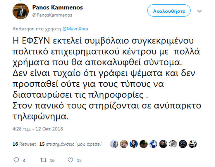 - Ο υπουργός μιλάει για ψευδή δημοσιεύματα στην εφημερίδα μας αλλά δεν αναφέρεται σε τίποτα απ’ όσα γράψαμε παρά μόνο στο ότι μετά τις επίμαχες δηλώσεις του στις ΗΠΑ υπήρξε τηλεφωνική επικοινωνία ανάμεσα στον ίδιο και στον πρωθυπουργό με πρωτοβουλία του τελευταίου. Σε ότι μας αφορά η είδηση αυτή είναι απολύτως διασταυρωμένη, παρά το γεγονός ότι κυβερνητικοί κύκλοι διαψεύδουν ότι το τηλεφώνημα έγινε. Γράφτηκε δε και σε άλλα ΜΜΕ- ηλεκτρονικά και έντυπα. Το γιατί ο κ. Καμμένος προτιμάει να αναφερθεί μόνο στην ΕΦΣΥΝ είναι ζήτημα προς διερεύνηση.