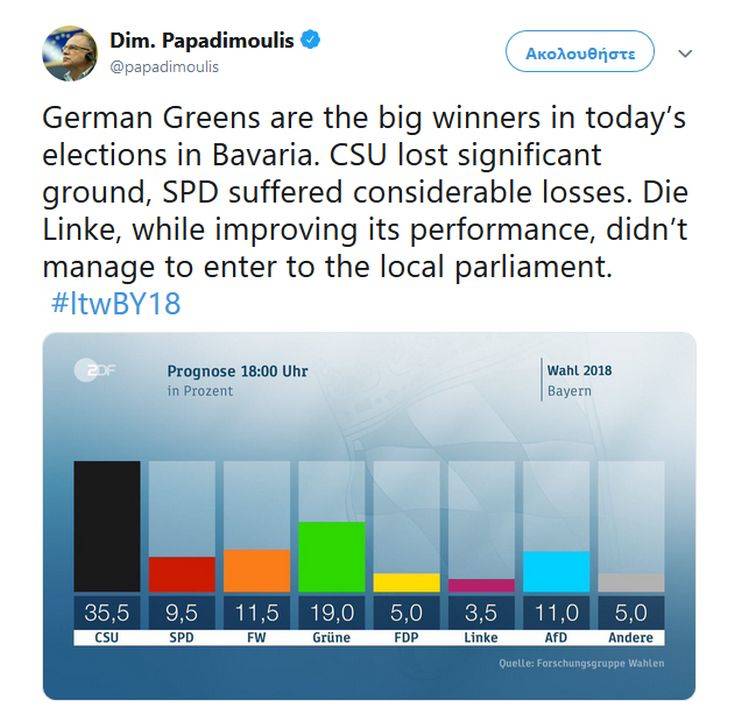 «Οι Πράσινοι ο μεγάλος νικητής των εκλογών στη Βαυαρία», αναφέρει με ανάρτησή του στο Twitter ο ευρωβουλευτής του ΣΥΡΙΖΑ, Δημήτρης Παπαδημούλης, σχολιάζοντας τα πρώτα αποτελέσματα από τις εκλογές στη Βαυαρία. «Μεγάλες απώλειες για τους Χριστιανοκοινωνιστές συμμάχους της Μέρκελ, και επίσης μεγάλες απώλειες για τους σοσιαλιστές. H Die Linke, παρότι αυξάνει τα ποσοστά της, παραμένει εκτός Βουλής», συμπληρώνει στο ποστ του, που είναι γραμμένο στην αγγλική γλώσσα, ο αντιπρόεδρος του Ευρωπαϊκού Κοινοβουλίου.