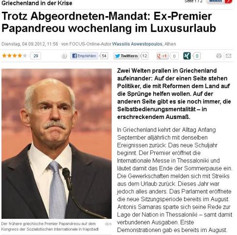 Επικριτικά σχόλια για τις πολυήμερες διακοπές του πρώην πρωθυπουργού Γιώργου Παπανδρέου, μεσούσης της οικονομικής κρίσης, κάνει το γερμανικό Focus, σε δημοσίευμα υπό τον τίτλο «Σε διακοπές πολυτελείας ο πρώην πρωθυπουργός Γ. Παπανδρέου».