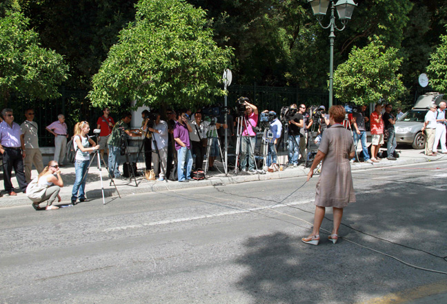 Το πεζοδρόμιο απέναντι από το Προεδρικό Μέγαρο κατέλαβαν τα τηλεοπτικά συνεργεία. Η ορκωμοσία της νέας κυβέρνησης είναι το γεγονός της ημέρας.