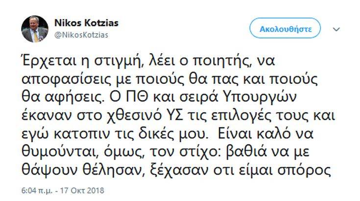 Ραγδαίες αναμένονται οι εξελίξεις στο κυβερνητικό στρατόπεδο μετά και την παραίτηση του Υπουργού Εξωτερικών, Νίκου Κοτζιά πριν από λίγο. Η παραίτηση έγινε δεκτή από τον Αλέξη Τσίπρα και όπως έγινε γνωστό από το γραφείο Τύπου του πρωθυπουργού, το χαρτοφυλάκιο του κ. Κοτζιά θα αναλάβει ο ίδιος ο πρωθυπουργός. Ο Νίκος Κοτζιάς έστειλε το δικό του, πρώτο, μήνυμα μετά την παραίτησή του μέσω του προσωπικού του λογαριασμού στο Twitter: «Έρχεται η στιγμή, λέει ο ποιητής, να αποφασίσεις με ποιούς θα πας και ποιούς θα αφήσεις. Ο ΠΘ και σειρά Υπουργών έκαναν στο χθεσινό ΥΣ τις επιλογές τους και εγώ κατοπιν τις δικές μου. Είναι καλό να θυμούνται, όμως, τον στίχο: βαθιά να με θάψουν θέλησαν, ξέχασαν οτι είμαι σπόρος».