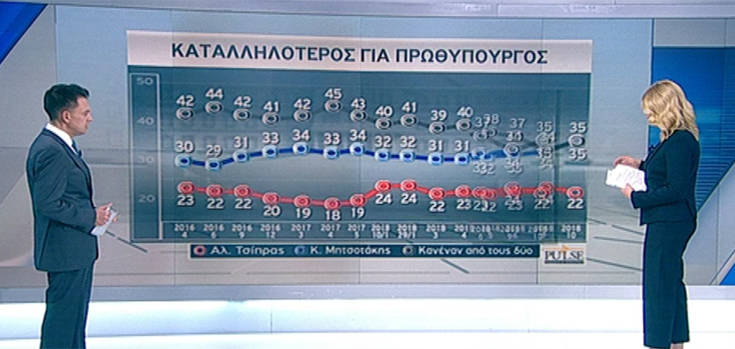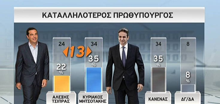 Τέλος, ο Κυριάκος Μητσοτάκης διεύρυνε το προβάδισμά του στην καταλληλότητα για την πρωθυπουργία κατά τρεις μονάδες σε βάρος του Αλέξη Τσίπρα, κερδίζοντας την εμπιστοσύνη του 35% των πολιτών, έναντι 22% για τον σημερινό πρωθυπουργό.