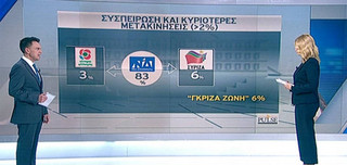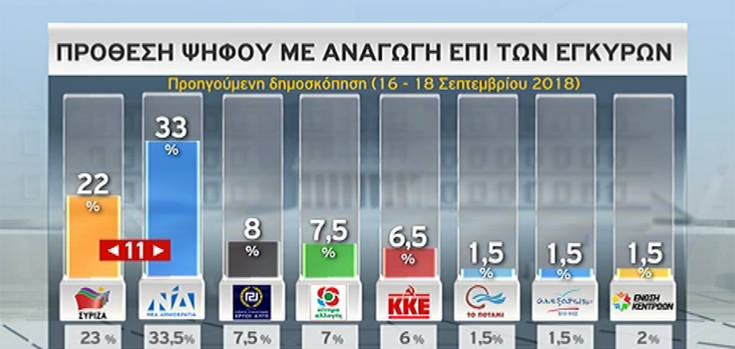 Νέα δημοσκόπηση της εταιρείας Pulse για λογαριασμό του ΣΚΑΪ παρουσιάστηκε το βράδυ της Πέμπτης στο κεντρικό δελτίο του σταθμού. Σύμφωνα με τα στοιχεία της έρευνας, η ΝΔ καταγράφει ένα σταθερό προβάδισμα της ΝΔ έναντι του ΣΥΡΙΖΑ στην πρόθεση ψήφου. Η ΝΔ συγκεντρώνει ποσοστό 33% στη μέτρηση επί των εγκύρων. Ο ΣΥΡΙΖΑ ακολουθεί 11 μονάδες πιο πίσω, κερδίζοντας το 22%.