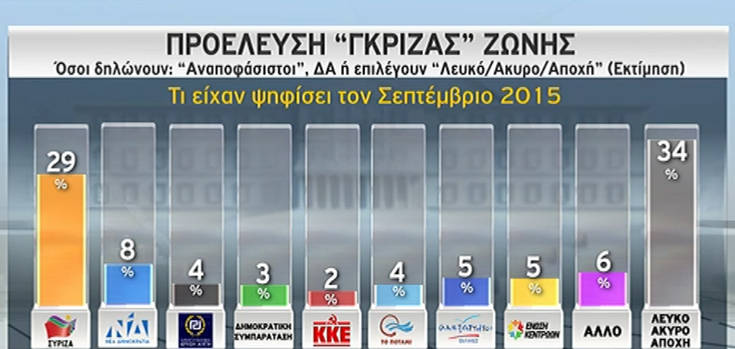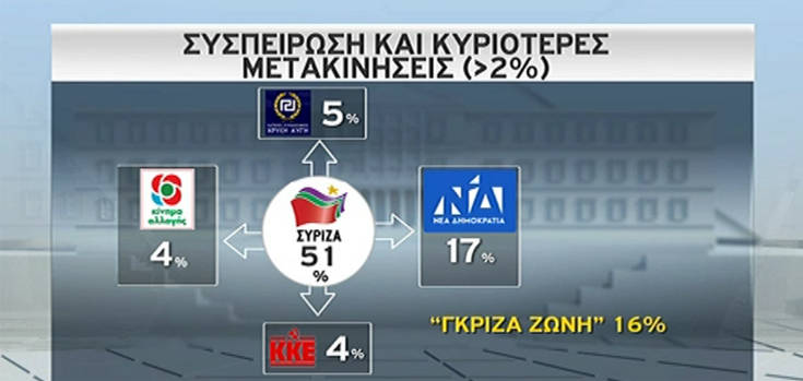 Ενδιαφέρον ωστόσο παρουσιάζει και το 17% των ψηφοφόρων ΣΥΡΙΖΑ φαίνεται πως έχει στραφεί στην ΝΔ. Επιπλέον, από την Κουμουνδούρου προέρχονται σχεδόν τρεις στους δέκα πολίτες της «γκρίζας ζώνης», η οποία περιέχει όσους δηλώνουν αναποφάσιστοι, διατεθειμένοι να απέχουν, να ψηφίσουν λευκό ή να ρίξουν άκυρο. Ενώ 5% από τους ψηφοφόρους του ΣΥΡΙΖΑ στρέφεται προς τη Χρυσή Αυγή