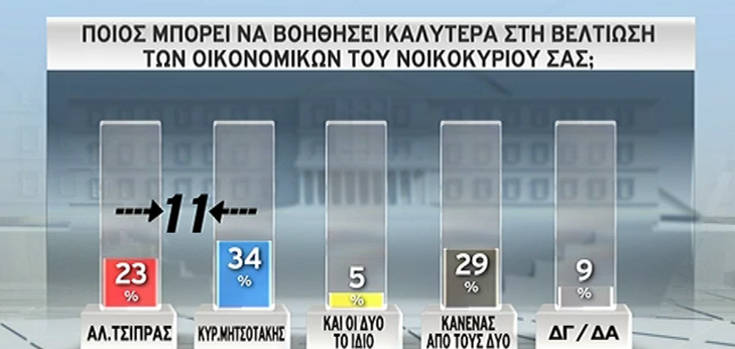 Ο κ. Μητσοτάκης προηγείται επίσης με 11 μονάδες του κ. Τσίπρα στο ξεχωριστό ερώτημα ποιος μπορεί να βοηθήσει καλύτερα στην βελτίωση των οικονομικών του νοικοκυριού σας.