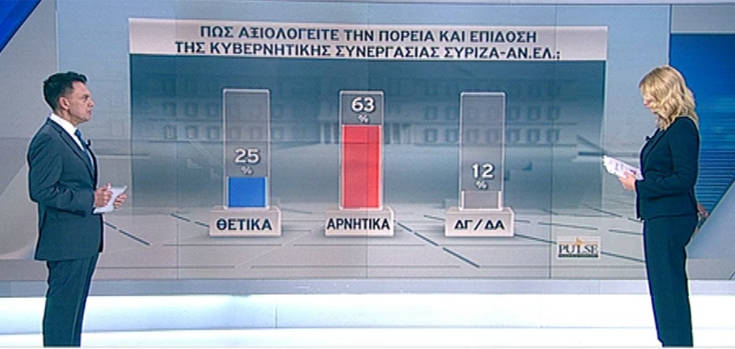 Το 63% δήλωσε πως βλέπει τις επιδόσεις της δικομματικής «μάλλον» ή «σίγουρα» αρνητικά, ενώ στην αντίπερα όχθη το 25% έκρινε την συμπολίτευση θετικά.