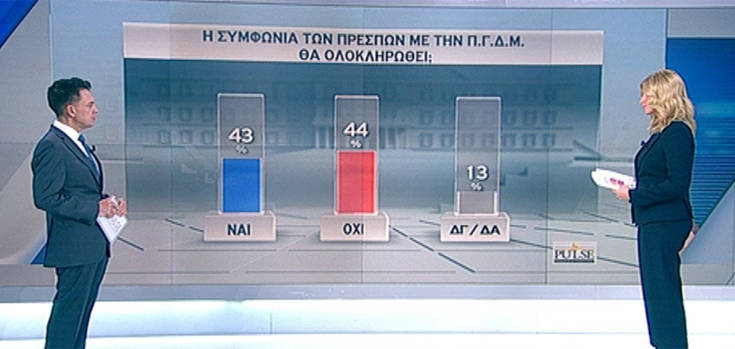 Η ελληνική κοινή γνώμη φαίνεται πως είναι απόλυτα διαιρεμένη όσον αφορά την προοπτική ολοκλήρωσης της συμφωνίας των Πρεσπών, η οποία έχει ήδη προκαλέσει έντονους τριγμούς στην σχέση των δύο κυβερνητικών εταίρων.