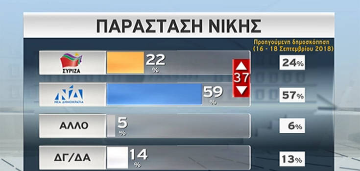 Το κόμμα της αξιωματικής αντιπολίτευσης απολαμβάνει μεγάλο προβάδισμα και στην παράσταση νίκης, 59% έναντι 22%, με το χάσμα να ανέρχεται στο υψηλότερο επίπεδο για το τρέχον έτος.