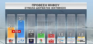 Τρίτη δύναμη είναι η Χρυσή Αυγή με 8%, ενώ ακολουθεί το Κίνημα Αλλαγής με 7,5% και πέμπτο κατατάσσεται το ΚΚΕ με 6,5%.