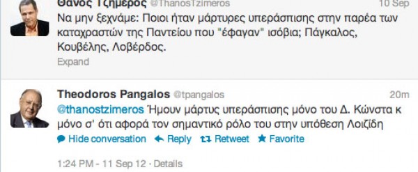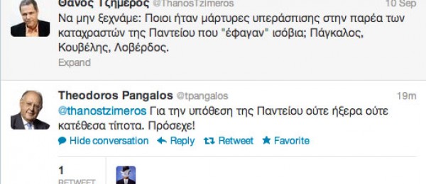 ‘Ένα σχόλιο του Θάνου Τζήμερου στο Twitter έγινε αφορμή να να γίνει πυρ και μανία ο Θεόδωρος Πάγκαλος. Ο Θ.Τζήμερος στο tweet που αναρτήθηκε χθες έγραψε: «Να μην ξεχνάμε: Ποιοι ήταν μάρτυρες υπεράσπισης στην παρέα των καταχραστών της Παντείου που έφαγαν ισόβια; Πάγκαλος, Κουβέλη Λοβέρδος».