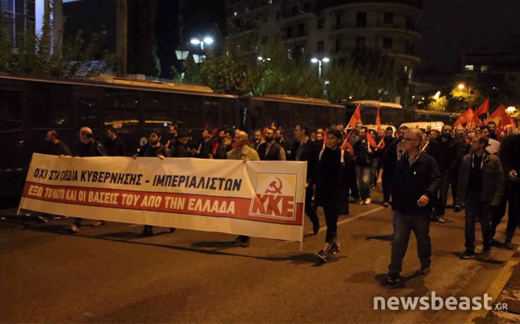 Στην αμερικανική πρεσβεία έφτασε η πορεία του ΚΚΕ το βράδυ της Δευτέρας ενάντια «στα σχέδια της κυβέρνησης για επέκταση και δημιουργία νέων αμερικανοΝΑΤΟικών βάσεων». Προηγήθηκε συγκέντρωση στο υπουργείο Άμυνας, όπου απηύθυνε ομιλία ο γενικός της ΚΕ του ΚΚΕ Δημήτρης Κουτσούμπας.