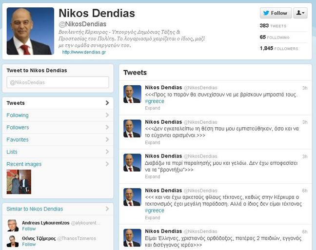 Ότι «δεν είναι τέκτονας», καθώς επίσης και ότι δεν έχει «αποφασίσει να τα βροντήξει» αναφέρει μέσω του twitter ο υπουργός Δημόσιας Τάξης και Προστασίας του Πολίτη, Νίκος Δένδιας απαντώντας σε φήμες κυκλοφόρησαν μέσω του διαδικτύου αλλά και ορισμένων ΜΜΕ.