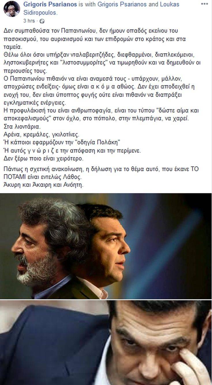 Ο Γρηγόρης Ψαριανός κράτησε αποστάσεις από την ανακοίνωση του Ποταμιού για την προφυλάκιση του Γιάννου Παπαντωνίου και τις αιχμές για την περίοδο διακυβέρνησης επί πρωθυπουργίας Κ. Σημίτη (1996-2004). Σε ανάρτηση στην προσωπική του σελίδα στο Facebook αναφέρει: «Δεν συμπαθούσα τον Παπαντωνίου, δεν ήμουν οπαδός εκείνου του πασοκισμού, του αυριανισμού και των επιδρομών στο κράτος και στα ταμεία. Θέλω όλοι όσοι υπήρξαν νταλαβεριτζήδες, διεφθαρμένοι, διαπλεκόμενοι, ληστοκυβερνήτες και “λιστοσυμμορίτες” να τιμωρηθούν και να δημευθούν οι περιουσίες τους. Ο Παπαντωνίου πιθανόν να είναι αναμεσά τους – υπάρχουν, μάλλον, αποχρώσες ενδείξεις- όμως είναι ακόμα αθώος. Δεν έχει αποδειχθεί η ενοχή του, δεν είναι ύποπτος φυγής ούτε είναι πιθανόν να διαπράξει εγκληματικές ενέργειες». Ο κ. Ψαριανός θεωρεί ότι «η προφυλάκισή του είναι ανθρωποφαγία, είναι του τύπου “δώστε αίμα και αποκεφαλισμούς” στον όχλο, στο πόπολο, στην πλεμπάγια, να χαρεί. Στα λιοντάρια. Αρένα, κρεμάλες, γκιλοτίνες. Ή κάποιοι εφαρμόζουν την “οδηγία Πολάκη” Ή αυτός γνώριζε την απόφαση και την περίμενε. Δεν ξέρω ποιο είναι χειρότερο», όπως επισημαίνει. Και για τη στάση του Ποταμιού υποστηρίζει ότι «η δήλωση για το θέμα αυτό, που έκανε ΤΟ ΠΟΤΑΜΙ είναι εντελώς Λάθος. ‘Ακυρη και ‘Ακαιρη και Ανόητη».