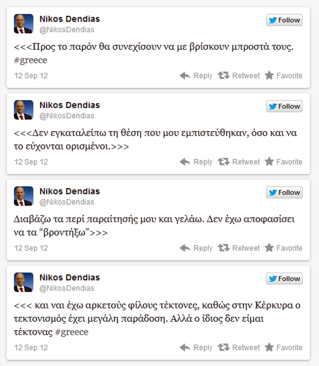 Απάντηση μέσω twitter έδωσε ο υπουργός Προστασίας του Πολίτη, Νίκος Δένδιας, στις φήμες που τον ήθελαν να σκέφτεται παραίτηση.