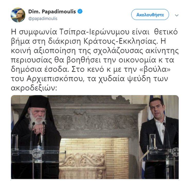 Ως «θετικό βήμα στη διάκριση Κράτους-Εκκλησίας» χαρακτηρίζει τη «συμφωνία Τσίπρα-Ιερώνυμου» ο Δημήτρης Παπαδημούλης, με ανάρτησή του στο Twitter. «Η κοινή αξιοποίηση της σχολάζουσας ακίνητης περιουσίας θα βοηθήσει την οικονομία και τα δημόσια έσοδα. Στο κενό και με την “βούλα” του Αρχιεπισκόπου, τα χυδαία ψεύδη των ακροδεξιών», σχολιάζει με την ίδια ανάρτηση ο αντιπρόεδρος του Ευρωπαϊκού Κοινοβουλίου.
