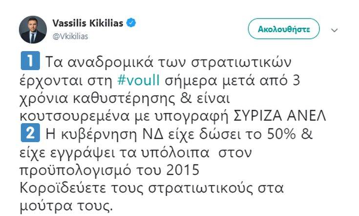 Την άποψη ότι η κυβέρνηση κοροϊδεύει τους στρατιωτικούς στο θέμα των αναδρομικών εξέφρασε μέσω ανάρτησής του στο Twitter ο Βασίλης Κικίλιας. Συγκεκριμένα, ο τομεάρχης ‘Αμυνας της Νέας Δημοκρατίας επισήμανε πως «τα αναδρομικά των στρατιωτικών έρχονται στη Βουλή σήμερα μετά από τρία χρόνια καθυστέρησης και είναι κουτσουρεμένα με υπογραφή ΣΥΡΙΖΑ-ΑΝΕΛ». Επίσης, σύμφωνα με τον κ. Κικίλια, «η κυβέρνηση ΝΔ είχε δώσει το 50% και είχε εγγράψει τα υπόλοιπα στον προϋπολογισμό του 2015. Κοροϊδεύετε τους στρατιωτικούς στα μούτρα τους».
