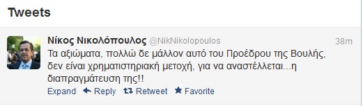 «Τα αξιώματα, πολλώ δε μάλλον αυτό του Προέδρου της Βουλής, δεν είναι χρηματιστηριακή μετοχή, για να αναστέλλεται…η διαπραγμάτευση της!», έγραψε χαρακτηριστικά στον προσωπικό του λογαριασμό στο Twitter.