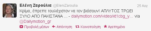 «Κρίμα, έπρεπε τουλάχιστον να τον βιάσουν! ΑΠΛΥΤΟΣ ΤΡΩΕΙ ΞΥΛΟ ΑΠΟ ΠΑΚΙΣΤΑΝΑ», είχε γράψει στο twitter της η σύζυγος του γενικού γραμματέα της Χρυσής Αυγής, Νίκου Μιχαλολιάκου, και βουλευτής, Ελένη Ζαρούλια. Και μαζί φυσικά με την ανάρτησή της, δημοσίευσε και ένα link από το δελτίο ειδήσεων του ΑΝΤ1 για να γνωστοποιήσει το περιστατικό.