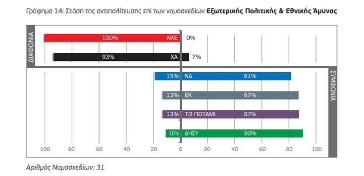Και στις δύο εξεταζόμενες περιόδους (2012-2015 και 2015-2018), το μεγαλύτερο ποσοστό συμφωνίας της εκάστοτε αξιωματικής αντιπολίτευσης με την κυβέρνηση σημειώθηκε στον τομέα της Εξωτερικής Πολιτικής και Εθνικής Άμυνας. Οι διαφοροποιήσεις ωστόσο είναι κι εδώ έντονες: Η ΝΔ ως αντιπολίτευση (2015-2018) υπερψήφισε το 80% των νομοσχεδίων που αφορούν την Εξωτερική Πολιτική και την Εθνική Άμυνα, έναντι αντίστοιχου ποσοστού μόλις 36% για τον αντιπολιτευτικό ΣΥΡΙΖΑ (2012-2015).