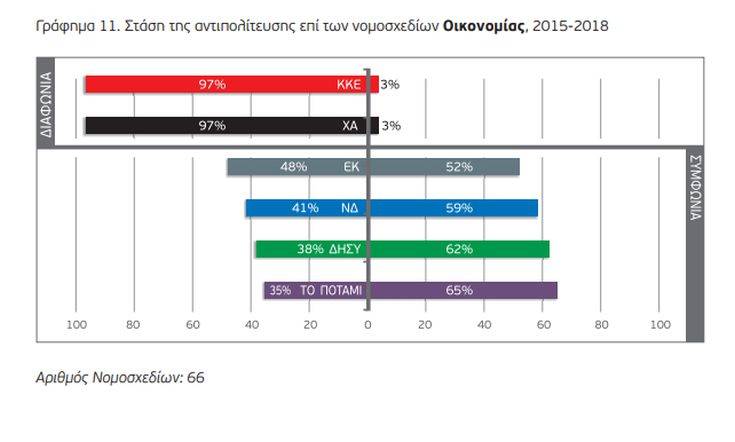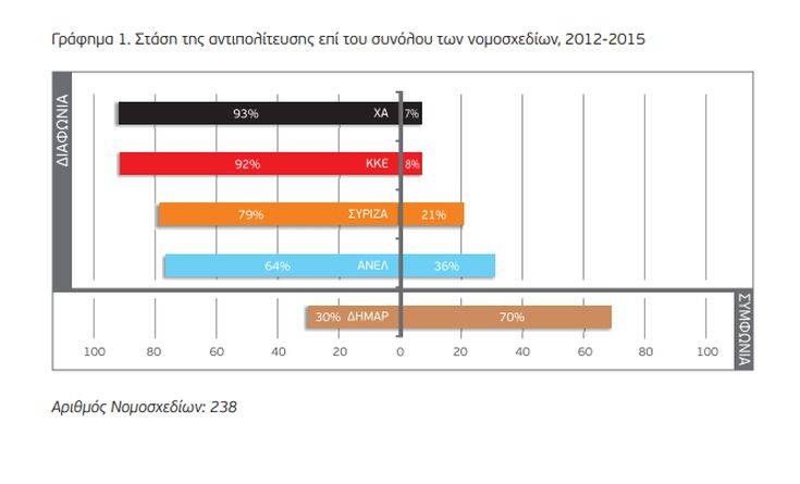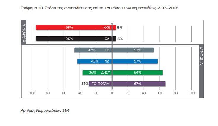 Σύμφωνα με τα συμπεράσματα της έρευνας, η ΝΔ ως αξιωματική αντιπολίτευση υπερψήφισε το 57% των νομοσχεδίων της συγκυβέρνησης ΣΥΡΙΖΑ – ΑΝΕΛ, ενώ αντίστοιχα ο ΣΥΡΙΖΑ από τη θέση της αξιωματικής αντιπολίτευσης υπερψήφισε μόλις το 21% των νομοσχεδίων της συγκυβέρνησης ΝΔ-ΠΑΣΟΚ (+ΔΗΜΑΡ).