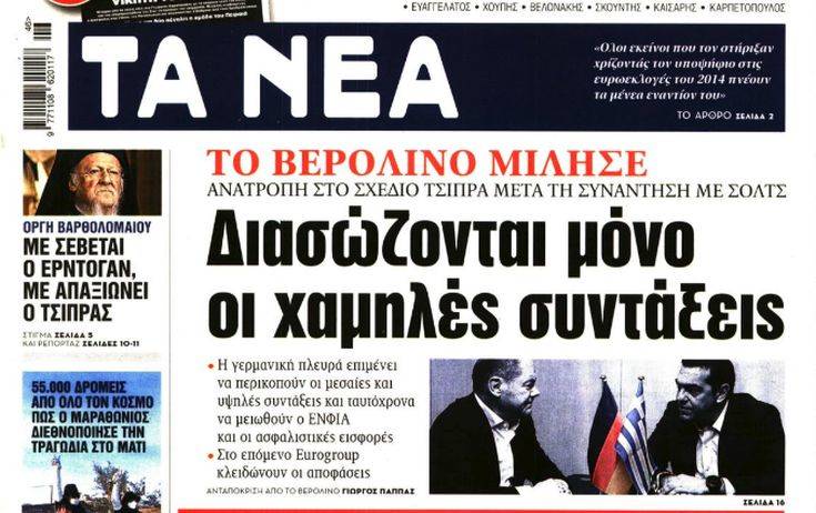 «Μέσα σε λίγες ώρες κατάφερε να διαψευσθεί κατηγορηματικά τόσο από το Πατριαρχείο για τους δήθεν διαλόγους του Οικουμενικού Πατριάρχη με τον υπουργό Παιδείας, όσο και από τον Γερμανό υπουργό Οικονομικών, που χαρακτήρισε το πρωτοσέλιδό τους για τις συντάξεις “αποκύημα φαντασίας”. Προτείνουμε να αλλάξουν τον τίτλο τους από τα Νέα σε Fake Νέα», καταλήγει η ανακοίνωση.