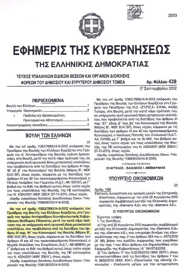 Ειδικότερα, σύμφωνα με το υπ΄ αριθμό 438 ΦΕΚ, της 17 Σεπτεμβρίου : «διορίζεται στο Γραφείο του πρώην Αντιπροέδρου της Κοινοβουλευτικής Κυβερνήσεως Θεόδωρου Πάγκαλου, μετά την κατά το νόμο πρότασή του, σε υπάρχουσα κενή οργανική θέση μετακλητού υπαλλήλου… ο Μ.Ψ. του Σ.»
