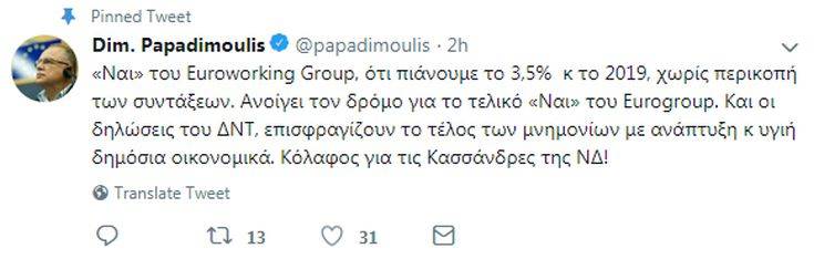 Κόλαφο για τις Κασσάνδρες της ΝΔ αποτελούν οι δηλώσεις του ΔΝΤ και το «ναι» του Eurogroup ότι «πιάνουμε το 3,5% και το 2019, χωρίς περικοπή των συντάξεων». που επισφραγίζουν το τέλος των μνημονίων, με ανάπτυξη και υγιή δημόσια οικονομικά, τονίζει σε ανάρτησή του στο Twitter ο αντιπρόεδρος του Ευρωπαϊκού Κοινοβουλίου, Δημήτρης Παπαδημούλης.