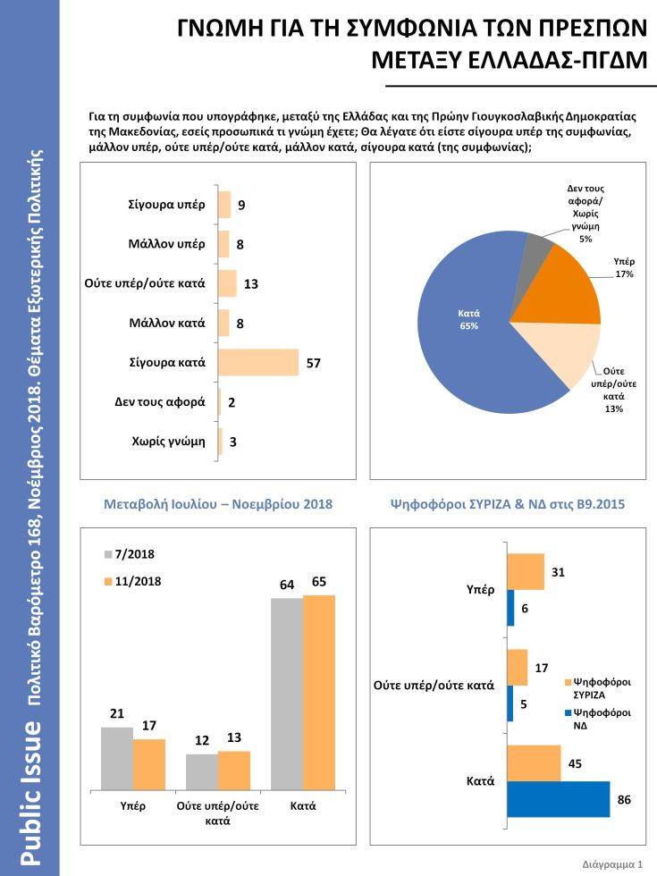 Στο σχετικό ερώτημα, το 65% των ερωτηθέντων δηλώνουν αντίθετοι στη Συμφωνία των Πρεσπών, έναντι 17% που τάσσονται υπέρ της και 13% που τηρούν ουδέτερη στάση. Μάλιστα, αντίθετοι με τη Συμφωνία εμφανίζονται και πολλοί ψηφοφόροι του ΣΥΡΙΖΑ, σε ποσοστό 45%, ενώ υπέρ της τάσσεται το 31% αυτών.