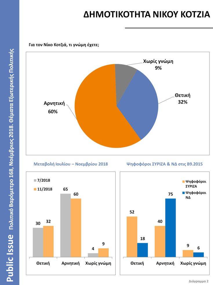 Αρνητική είναι εξάλλου η γνώμη των πολιτών για τον πρώην υπουργό Εξωτερικών Νίκο Κοτζιά. Το 60% των ερωτηθέντων εκφράζονται αρνητικά προς το πρόσωπό του, έναντι 32% που εκφράζονται θετικά. Μεταξύ των ψηφοφόρων του ΣΥΡΙΖΑ, πάντως, το 52% εκφράζει θετική γνώμη και το 40% αρνητική.