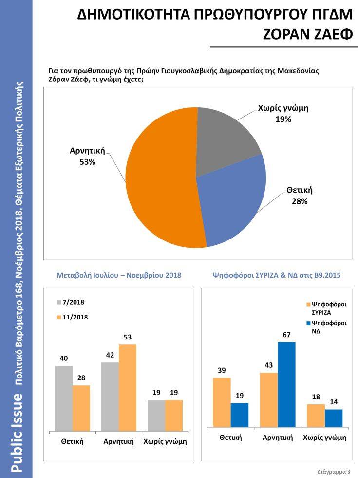 Αρνητική γνώμη εκφράζουν περισσότεροι από τους μισούς πολίτες (53%) και για τον πρωθυπουργό της ΠΓΔΜ, Ζόραν Ζάεφ, ενώ οι ψηφοφόροι του ΣΥΡΙΖΑ εμφανίζονται διχασμένοι, με το 39% να εκφράζει θετική γνώμη και το 43% αρνητική.