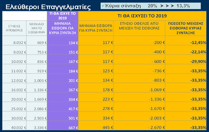Ένας ελεύθερος επαγγελματίας που βγάζει 12.000 το χρόνο, θα έχει ετήσια μείωση κατά 800 ευρώ για την εισφορά κύριας σύνταξης, ήτοι 33% επίσης.