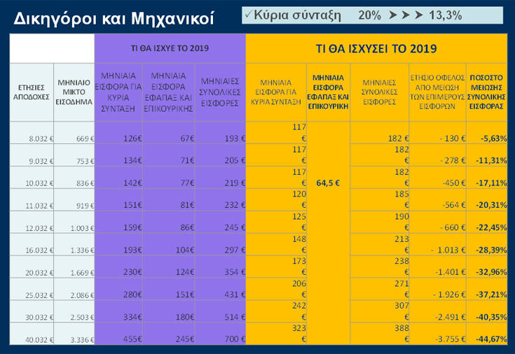 Ένας μηχανικός που βγάζει 1.600 ευρώ το μήνα, θα δει ετήσια μείωση 1400 ευρώ της συνολικής εισφοράς για κύρια σύνταξη και εφάπαξ, δηλαδή 33%.