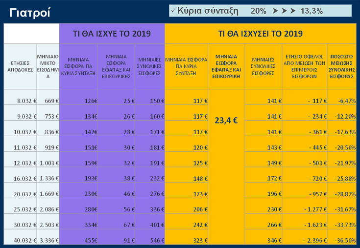 Ένας γιατρός με μηνιαίο εισόδημα 2.000 ευρώ, θα έχει μείωση της ετήσιας συνολικής εισφοράς – δηλαδή κύρια σύνταξη και εφάπαξ – 1.270 ευρώ, δηλαδή 33%.