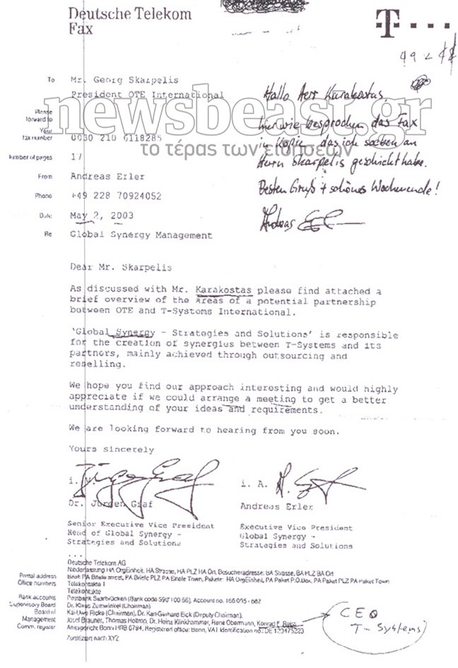 Σχολιάζοντας το συγκεκριμένο έγγραφο με ημερομηνία 2-5-2003, ο Δημήτρης Παπαδημούλης δήλωσε ότι «οι συνεχιζόμενες αποκαλύψεις από το αρχείο του Καρακώστα επιβεβαιώνουν ότι όχι μόνο δεν είναι μαρίδα, αλλά είχε για χρόνια οργανικό ρόλο στο αμαρτωλό τρίγωνο OTE-Siemens-Intrakom. Το τελευταίο έγγραφο αποδεικνύει ότι το τρίγωνο ήταν μάλλον τετράγωνο, με τη συμμετοχή της Deutsche Telekom και στη συνέχεια απέκτησε τον έλεγχο του ΟΤΕ».