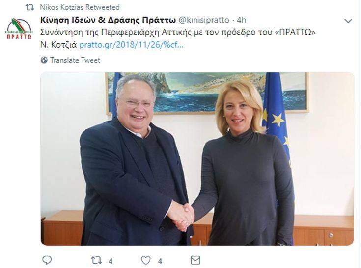 Τη σαφή στήριξη της Κίνησης «ΠΡΑΤΤΩ» στο έργο της περιφερειάρχη Αττικής Ρένας Δούρου, εξέφρασε ο πρόεδρος της, πρώην υπουργός Εξωτερικών Νίκος Κοτζιάς κατά τη σημερινή τους συνάντηση στα γραφεία της Περιφέρειας.